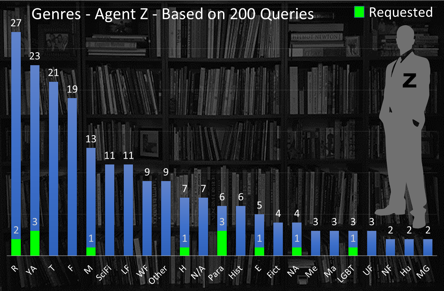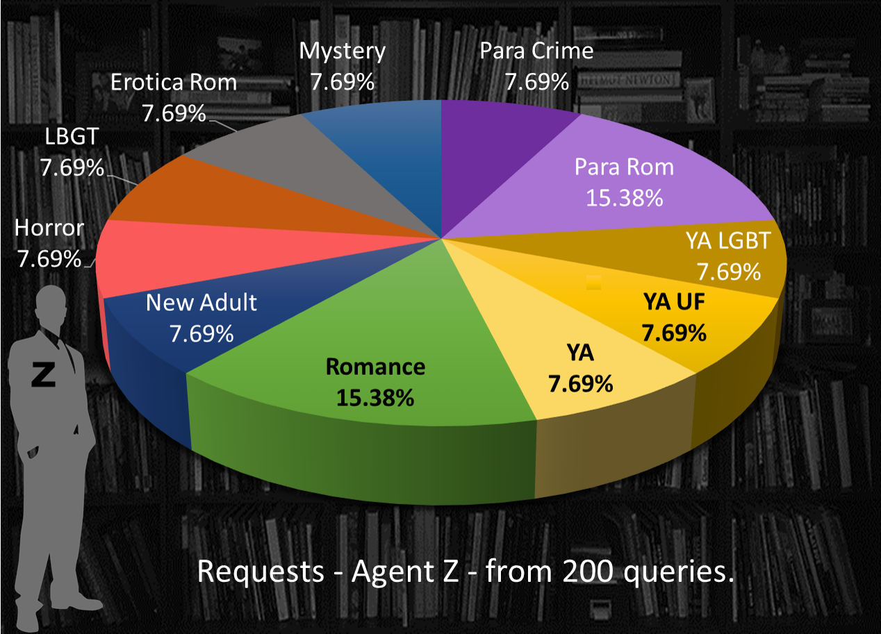 Agent Z requested 3 Paranormal, 3 Young Adult, 2 Romance, and 1 New Adult, Horror, LGBT, Erotica, and Mystery. Science Fiction is nowhere to be seen.