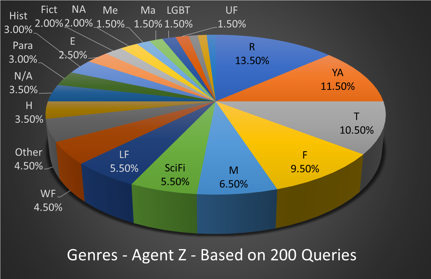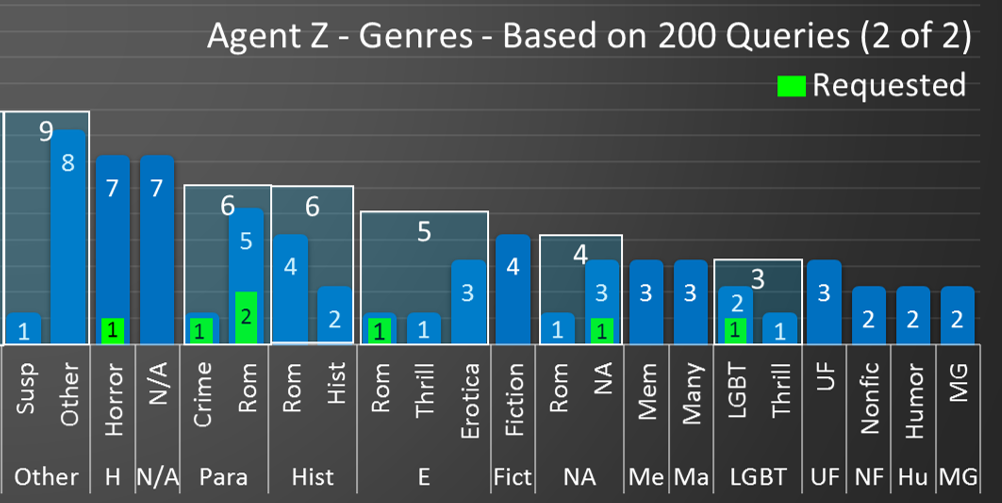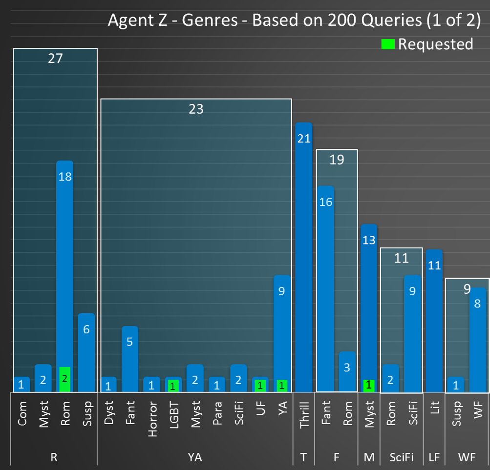 Most queries sent to agent Z were in Romance, Young Adult, Thriller and Fantasy, but not by much. His queries were all over the place. He seems to have a preference for Paranormal since 50% of all Paranormal submissions were requested.